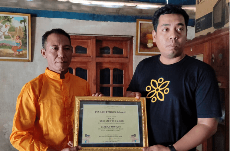 JOMBANG – Salah satu problem pemajuan budaya lokal Kesenian Wayang Topeng Sandur Desa Manduro, Kec. Kabuh menemukan titik temu positif. Kali ini, solusi itu datang dari Yayasan Bimasakti Peduli Negeri (YBPN). Melalui program pelestarian budaya lokal, YBPN menyalurkan bantuan seperangkat kostum dan topeng kepada Rifai selaku ketua Sanggar Panji Arum, pengelola kelompok seni Topeng Sandur.